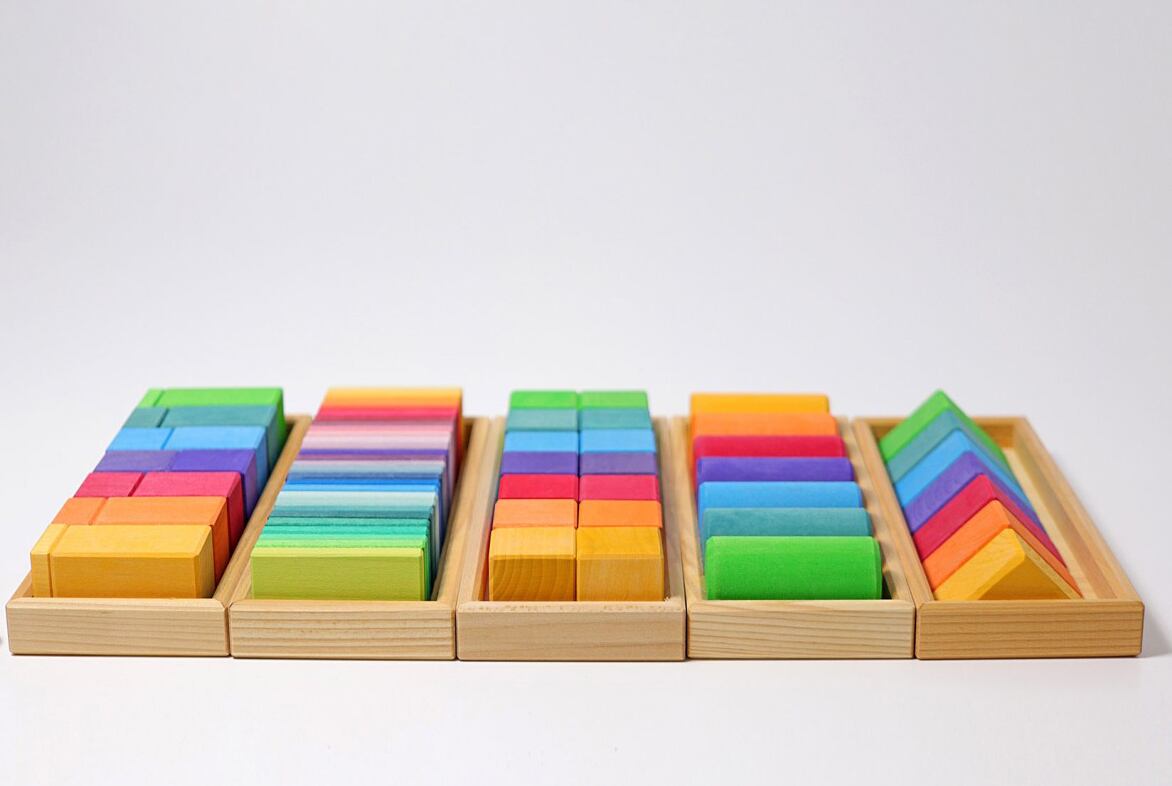 7色の美しいグラデーションと5つの基本図形で構成された、オープンエンド(遊び方が決まっていない)な知育玩具です。