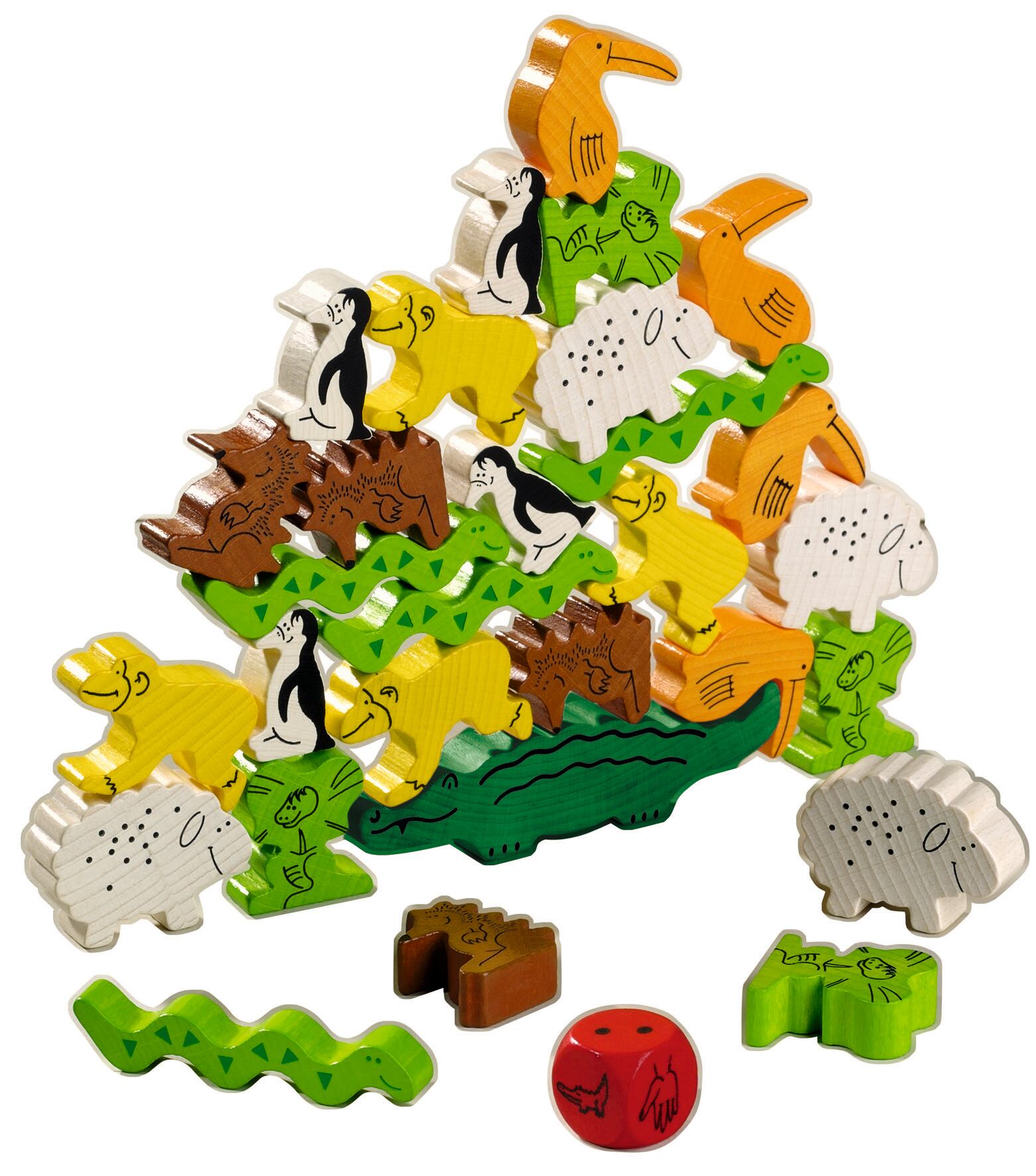 サイコロを振り、サイコロのシンボルが示す指示に従て、動物を土台のワニに重ねていきます。