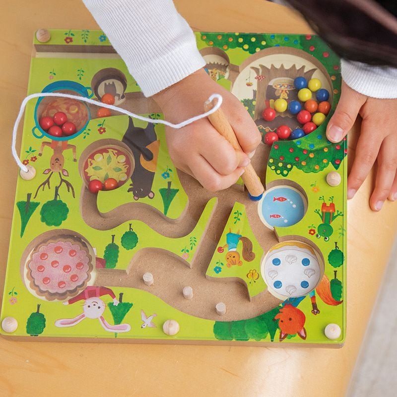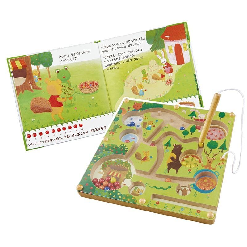物語にそってボードの中の玉をマグネットペンで運ぶことで、数の数え方や色の認識力が 深まるだけでなく、遊びながらペンの持ち方や手先の器用性、思考力、集中力を養うことができます。