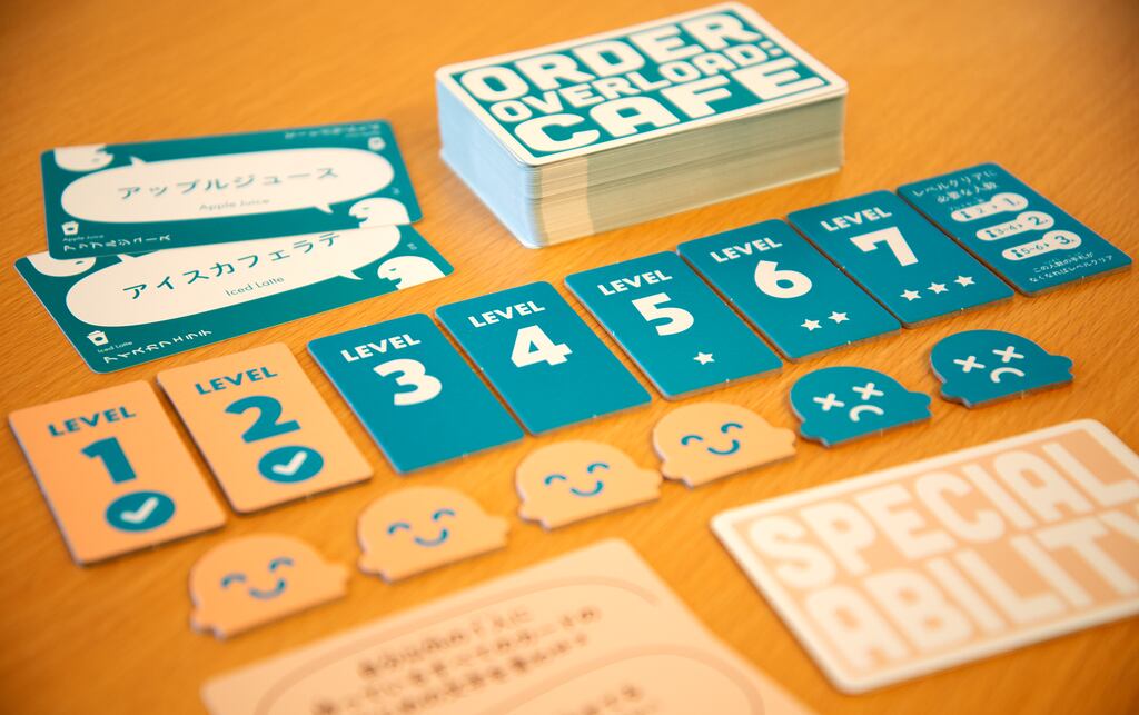 【内容】 注文カード 84枚 ・スペシャルカード 6枚・ レベルチップ 8枚・店員チップ 6枚・遊び方説明書
